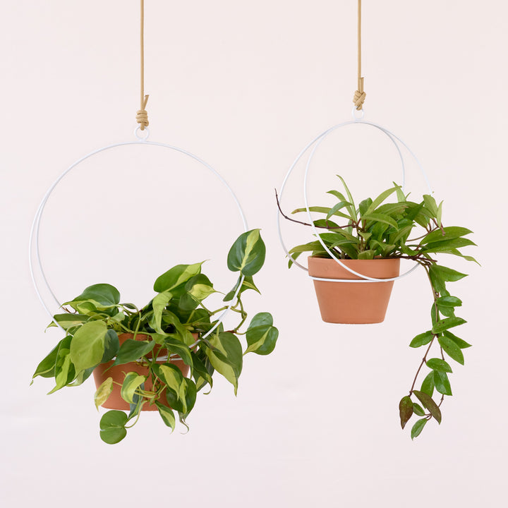 You can use a chic terracotta planter with your hanger, or you can just slip a 15cm or 20cm nursery pot into it, and it time the hanger can double up as a trellis.