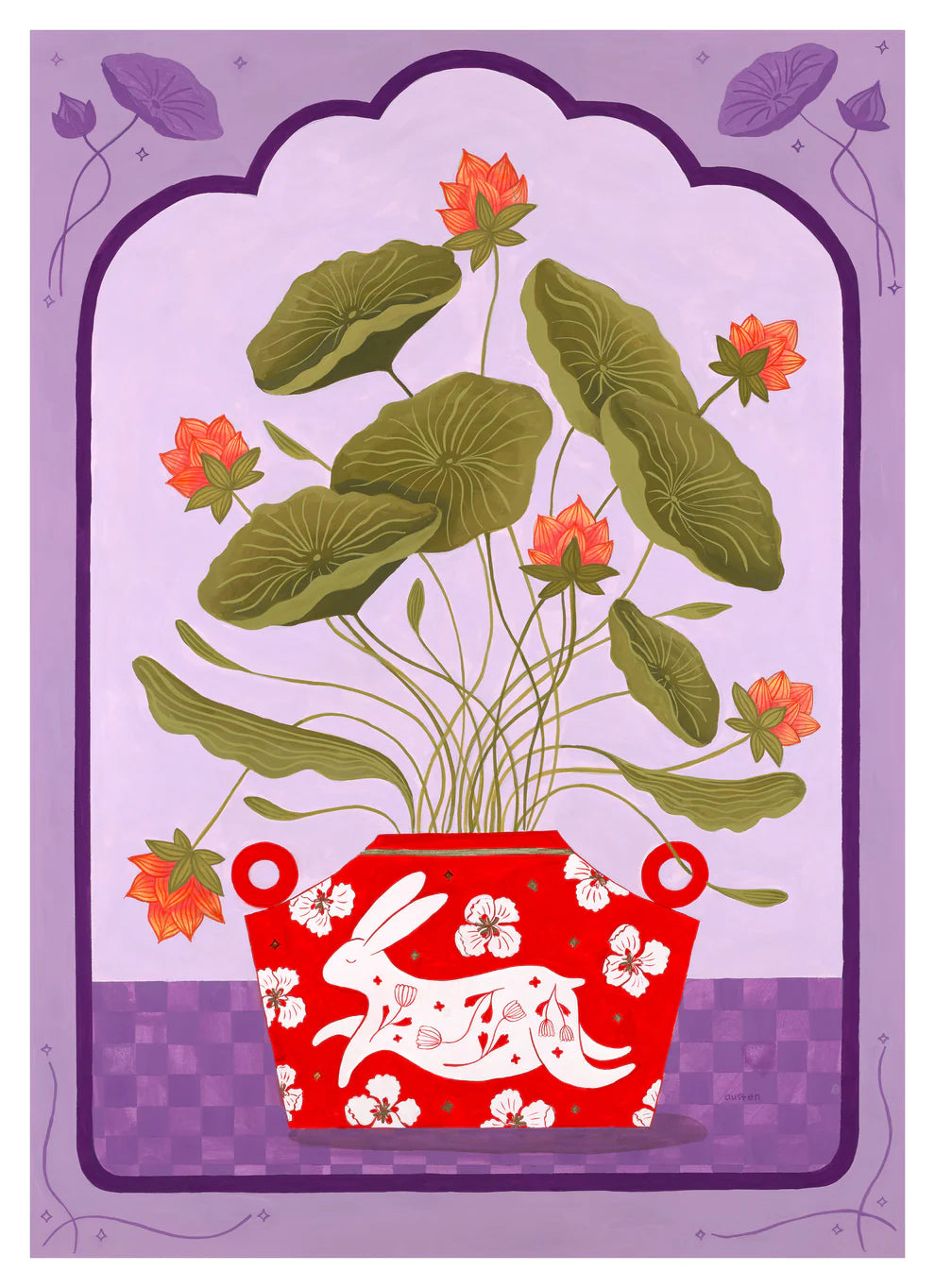 This fine art print features a unique botanical arrangement set in a richly patterned red vessel, adorned with delicate floral details and a playful hare motif. Soft green foliage and warm orange blooms stand out against a lilac-toned background, framed by subtle decorative borders to create a joyful, decorative composition with a contemporary folk-art feel.