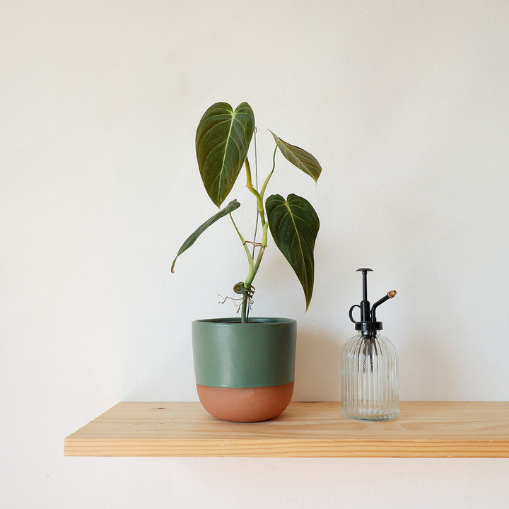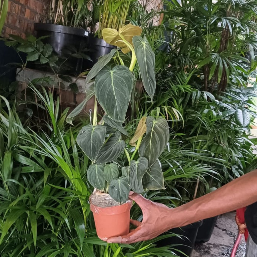 The Philodendron Melanochrysum is a botanical masterpiece, much prized for its velvety foliage and stunning presence. This exquisite plant has large, heart-shaped leaves with a deep, rich green hue that invites you to touch and admire it.