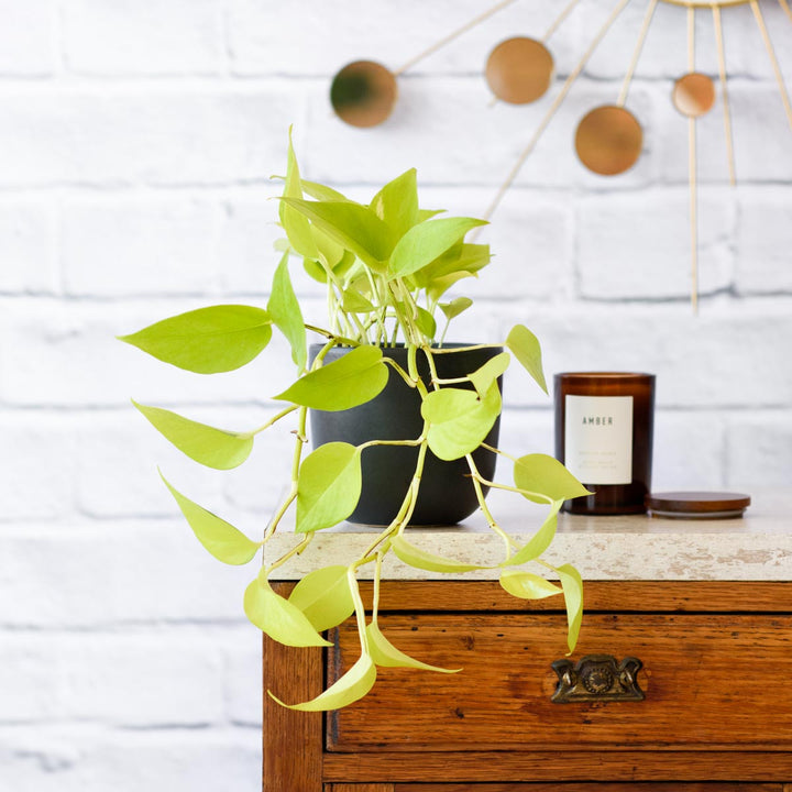 The Pothos Neon houseplant is a great candidate for being paired with an austere contrasting planter in a macrame hanger allowing it to cascade freely and elegantly.