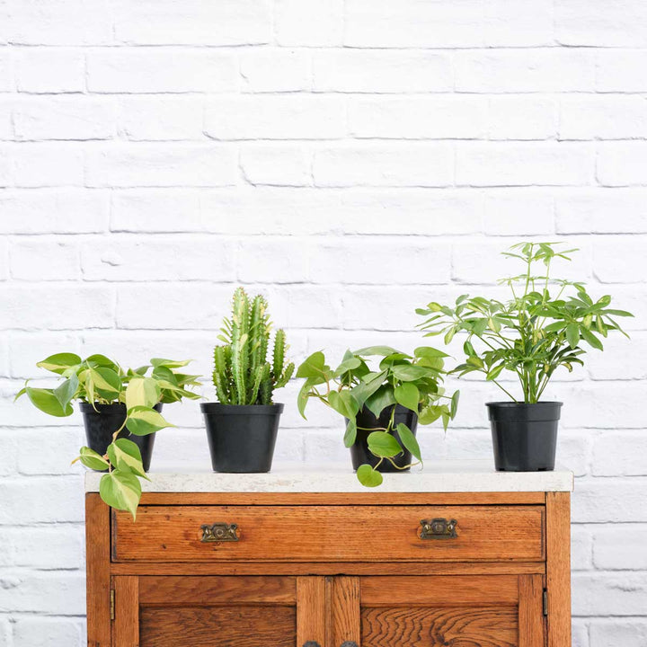 This package includes: African Milk Tree, Umbrella Plant, Philodendron Brasil and a Heartleaf Philodendron.