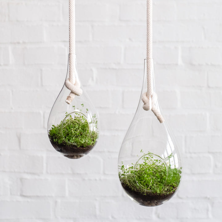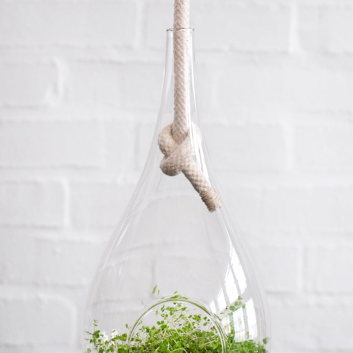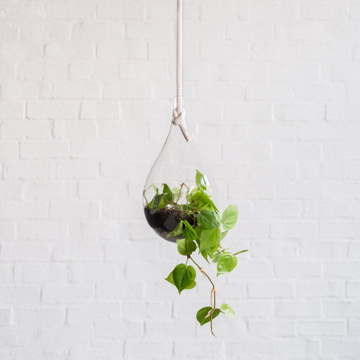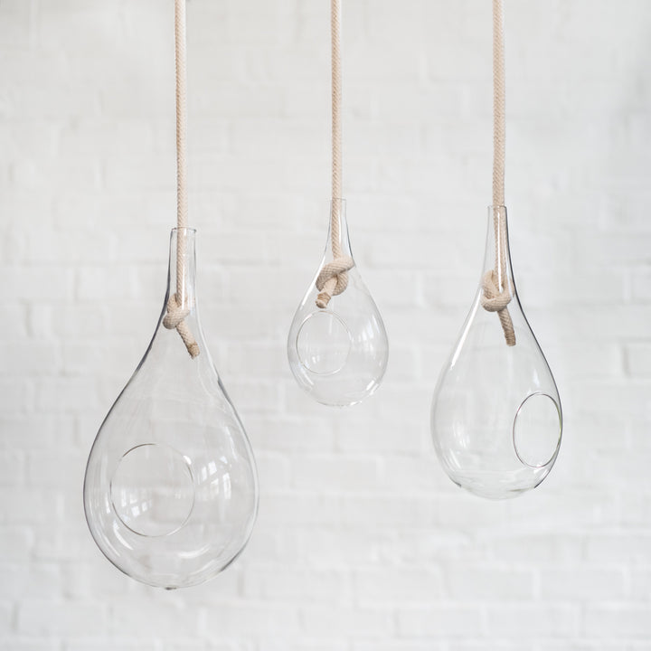 The elegant range of Raindrop Planters are stylish and versatile. Place cut flowers, an air plant or trailing plant inside these glass receptacles, which are suspended from a durable yet earthy Jute-cord.