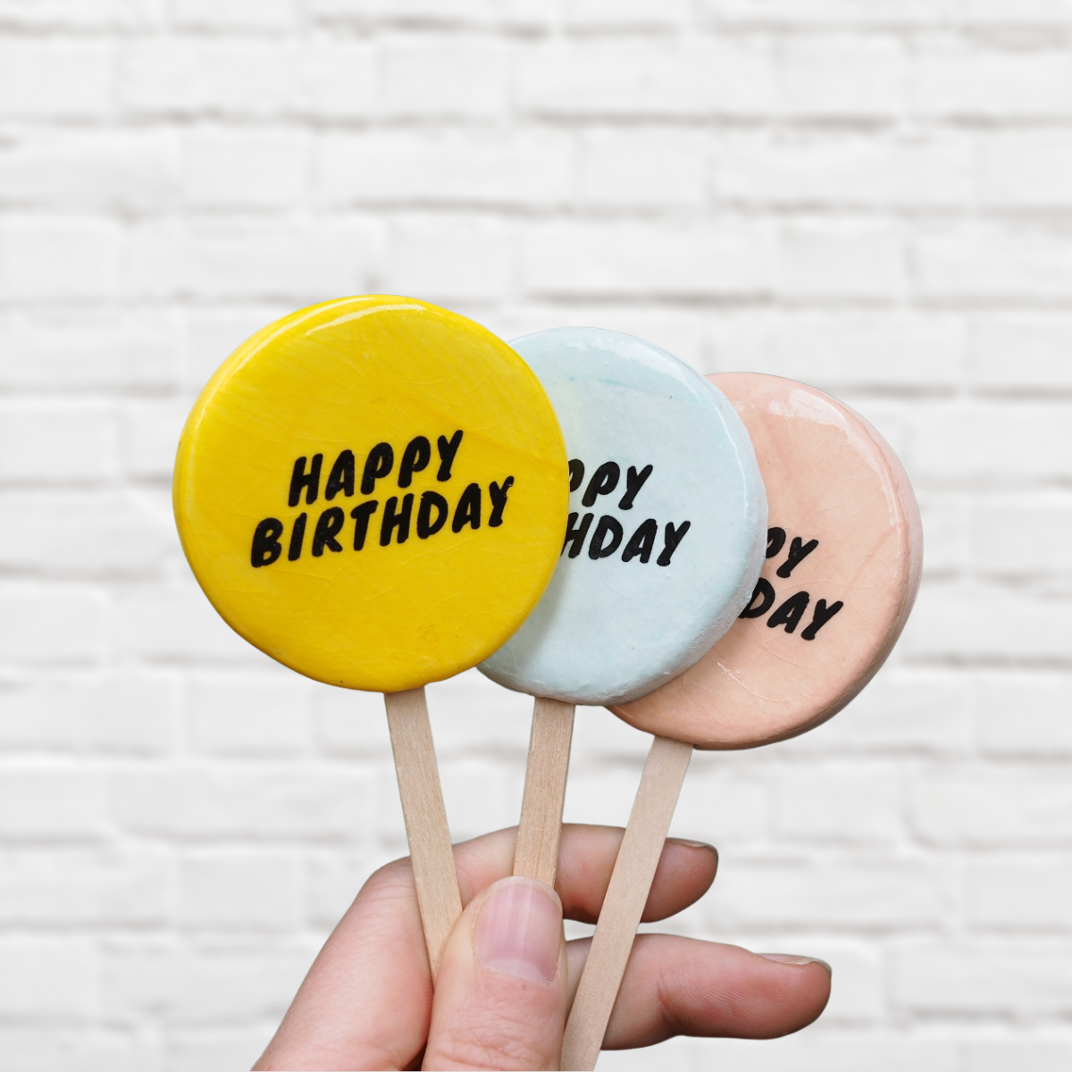 These ceramic message lollipops are hand-made locally and come in three colours with four different messages - perfect for any occasion.